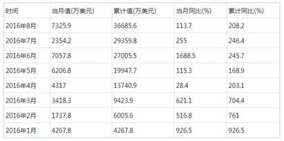 數據顯示,2016年1-8月中國風力發電機組出口金額為36685.6萬美元,同比增長208.2%。其中,8月出口金額現今年最高峰,達到7325.9萬美元。2016年1-8月中國風力發電機組出口金額統計表如下表所示: