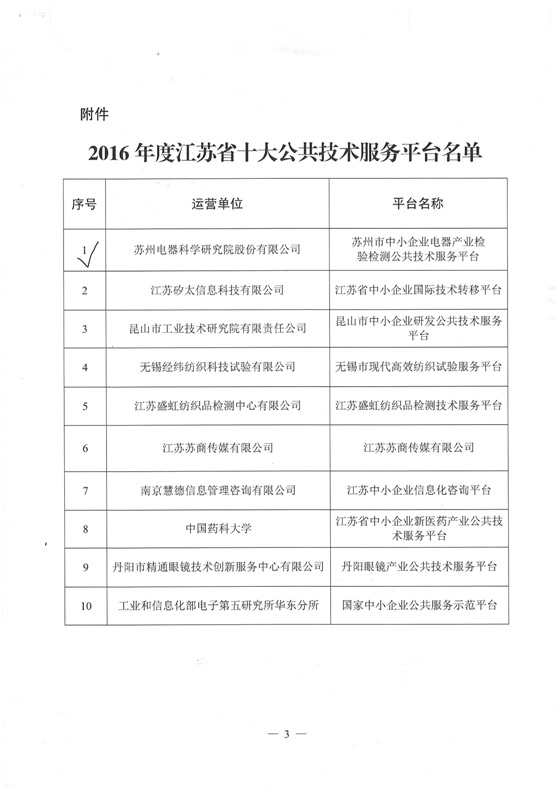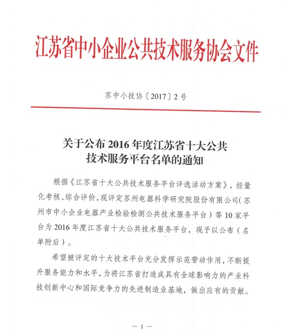 近期收文獲悉,我院參選的 “2016年度江蘇省十大中小企業(yè)公共技術(shù)服務(wù)平臺(tái)”評(píng)選活動(dòng)已經(jīng)結(jié)束,其中掛靠在我院的蘇州市中小企業(yè)電器產(chǎn)業(yè)檢驗(yàn)檢測(cè)公共技術(shù)服務(wù)平臺(tái)成功入選。