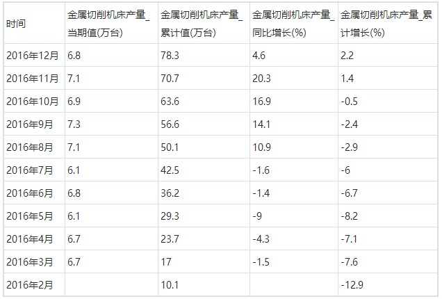 以下為2016年2月至12月我國金屬切削機床產量統計: