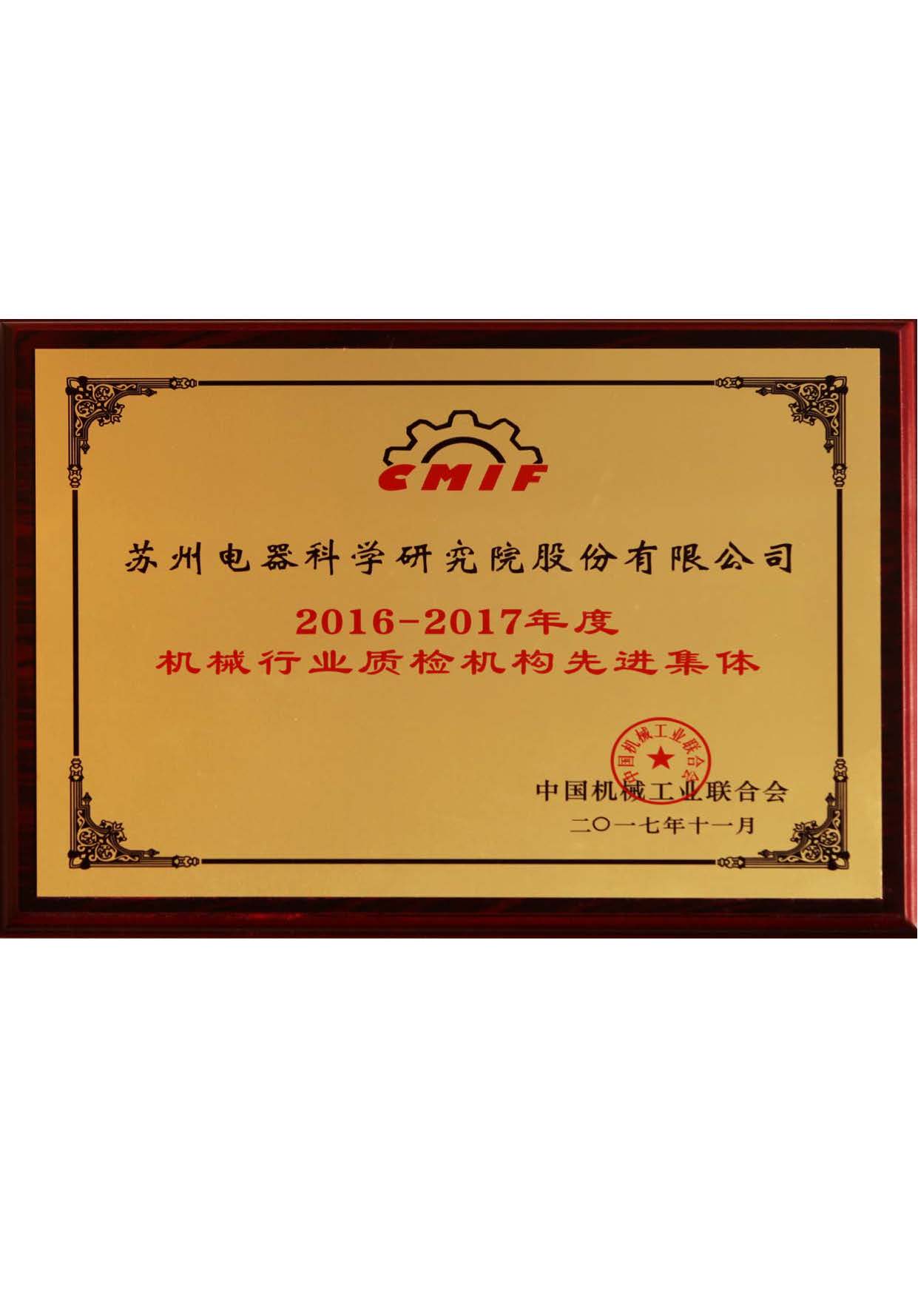 蘇州電科院榮獲2016-2017年度機械行業質檢機構先進集體榮譽稱號