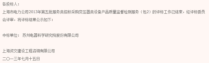 上海市電力公司2013年第五批服務類招標采購變壓器類設備產品質量監督檢測服務(包2)中標結果公告